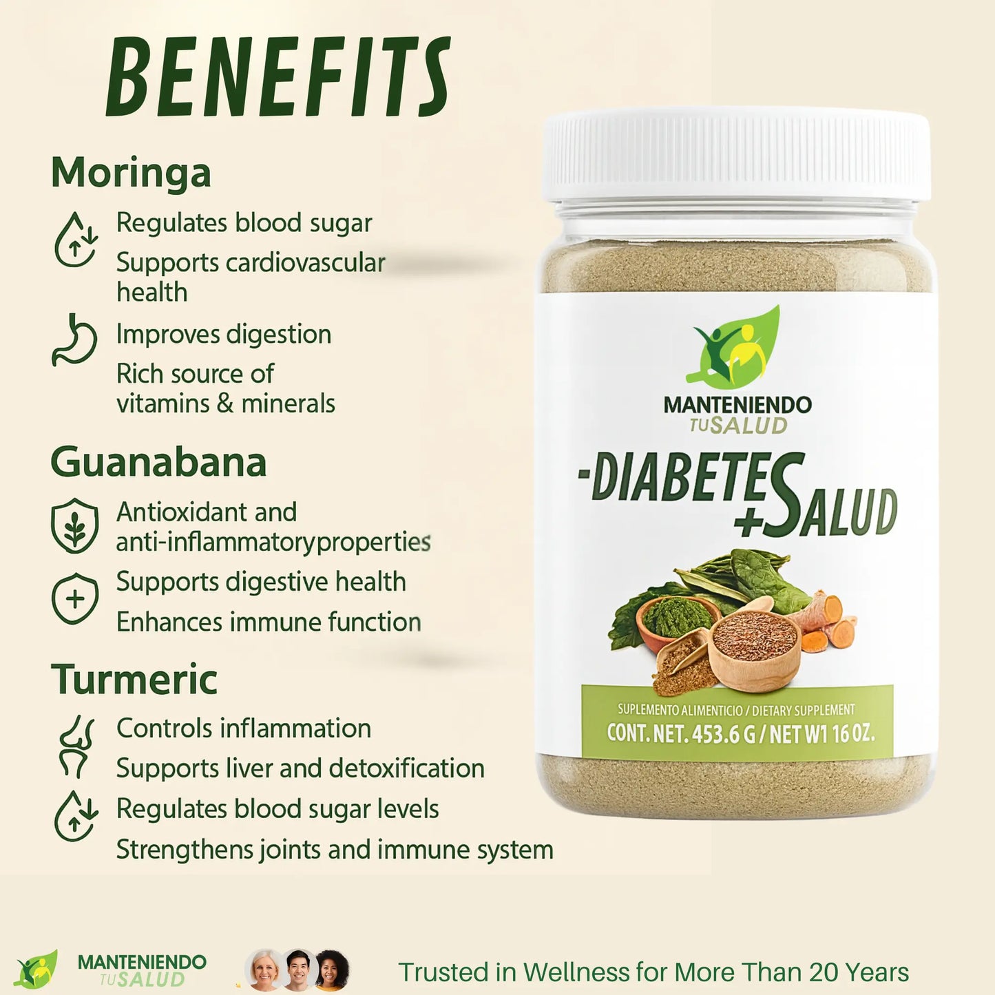 - Diabetes + Salud es un suplemento natural formulado específicamente para ayudar a las personas que lidian con diabetes. Este producto de 16oz es una excelente adición a su rutina de bienestar, ofreciendo potenciales beneficios para su salud.