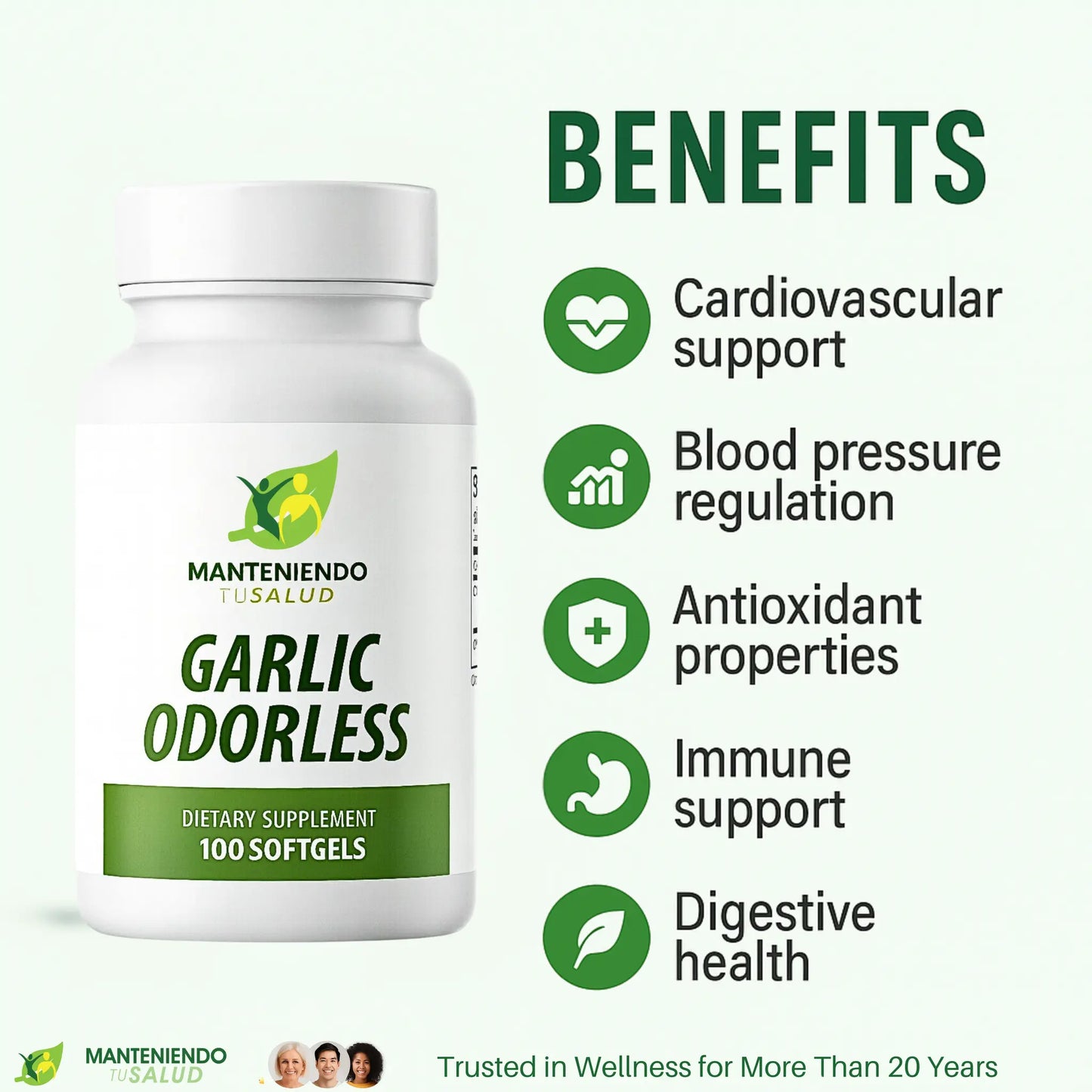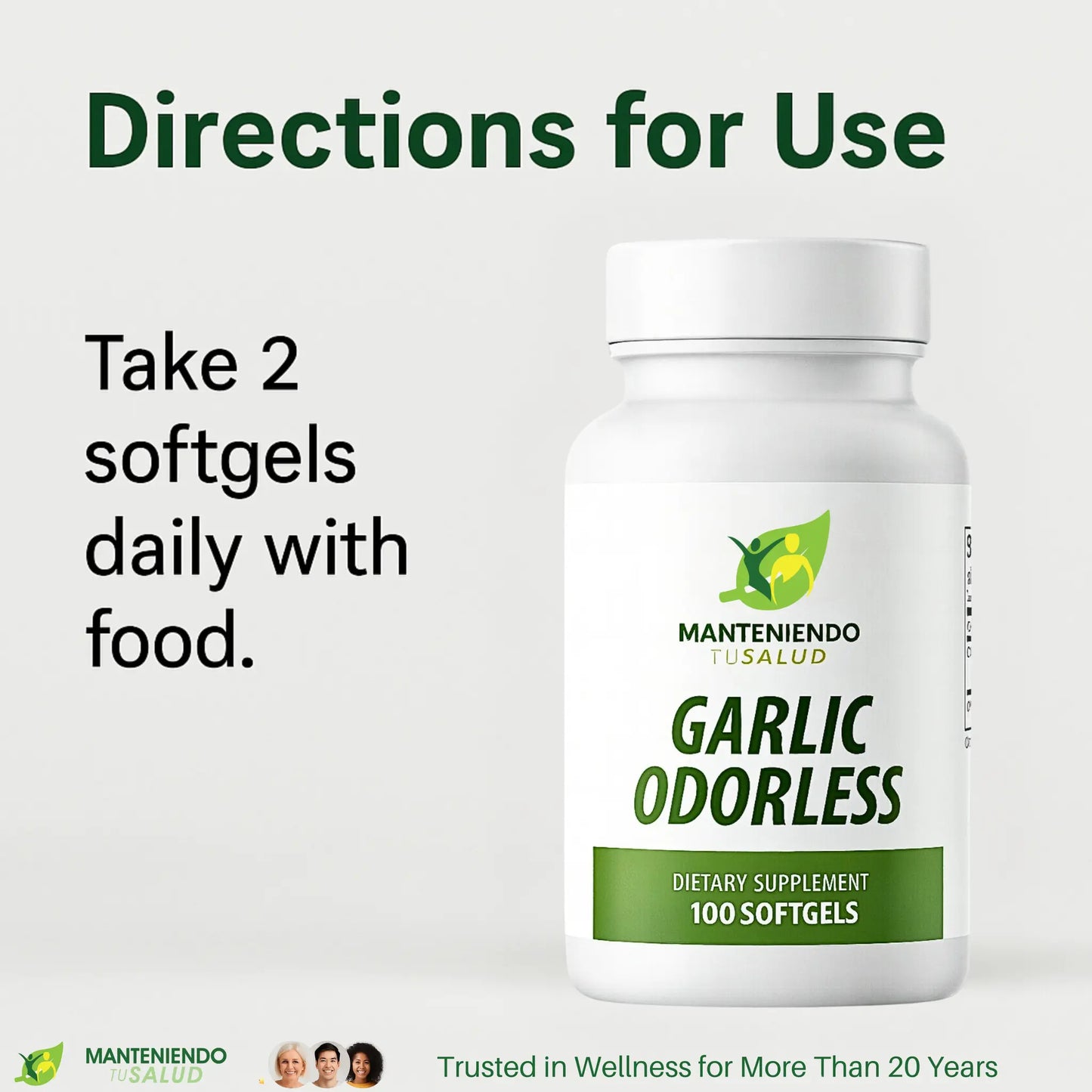Potencia tu bienestar con el exquisito poder de nuestro extracto de Garlic Odorless. Esta potente hierba se ha utilizado durante siglos para apoyar la salud cardiovascular y el bienestar general. Y ahora, puede aprovechar este apoyo atemporal en una cómoda forma de cápsula blanda de alta potencia. Entonces, comience su viaje con este excelente suplemento, porque con nuestras cápsulas blandas de Ajo Inodoro 3000 mg 100, un mejor bienestar está realmente a su alcance.