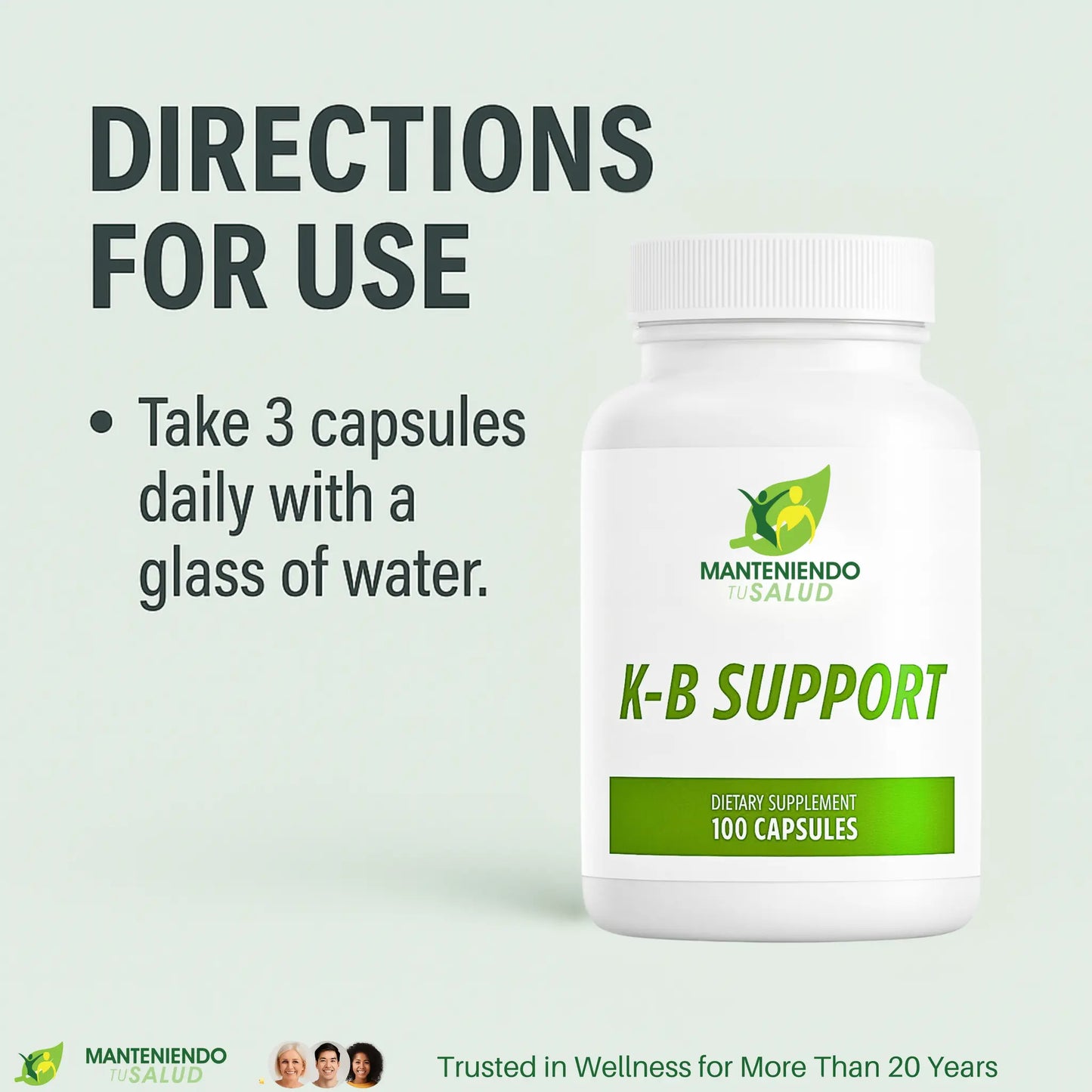 Cuidar tus riñones es fundamental porque juegan un papel clave en la depuración de tu organismo. Pero, gracias a las cápsulas KB Support, apoyar a sus riñones nunca ha sido tan fácil. Sólo dos cápsulas al día y estará en camino de mejorar la salud de sus riñones. Entonces, ¿por qué esperar? ¡Mejora tu bienestar ahora con nuestras cápsulas KB Support!