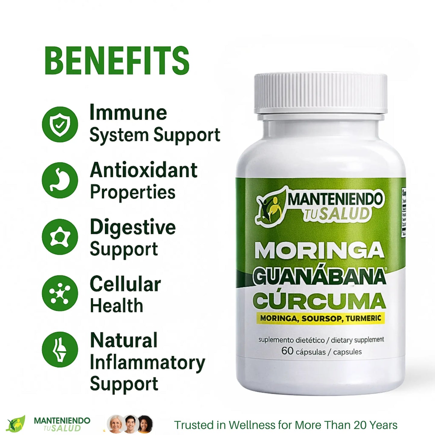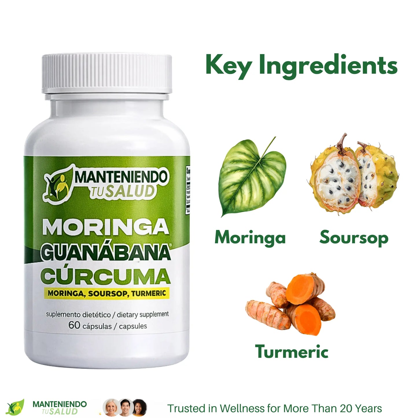 Moringa, Guanabana, and Curcumin work in harmony to provide excellent support for your immune system. Moringa is rich in vitamins and nutrients, so it helps strengthen your body’s defenses. Additionally, Guanabana, or Soursop, offers antioxidants that protect your cells from damage. Because of these powerful components, this supplement is an effective addition to your daily health regimen.