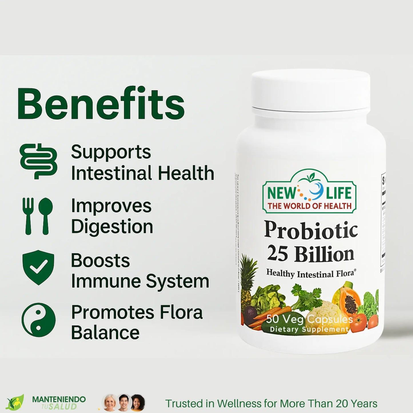 Adopte la solución natural para la salud digestiva con Probiotic 25 Billion. Nuestro suplemento natural contiene 50 cápsulas vegetales, cada una repleta de bacterias beneficiosas para apoyar su sistema digestivo. Pero ¿por qué optar por un probiótico? Porque los probióticos son una parte esencial para mantener un intestino sano y, en última instancia, aumentan el bienestar general.