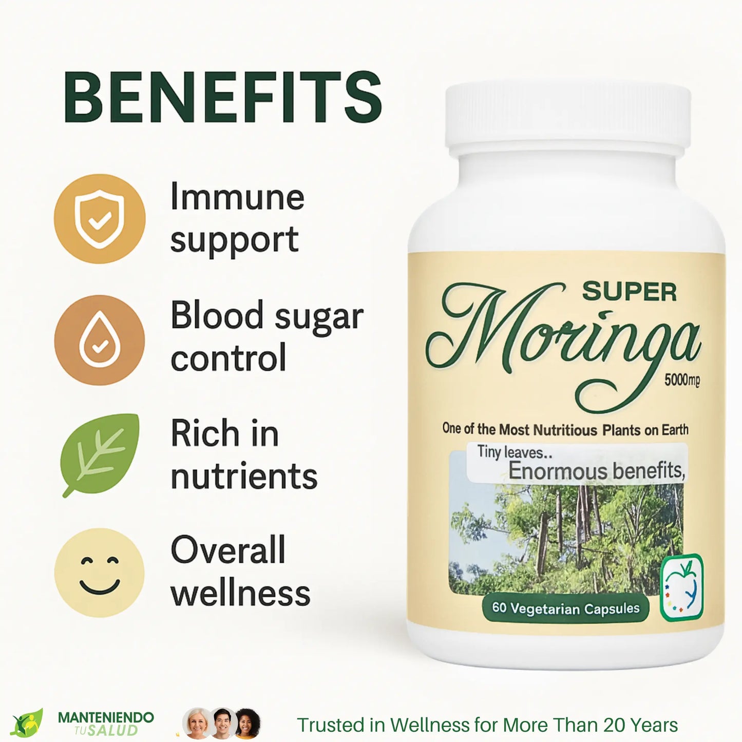 La moringa, también conocida como el árbol milagroso, es famosa en todo el mundo por sus beneficios para el bienestar. Esta cápsula de Super Moringa contiene 5000 mg de hoja pura de Moringa, que resume los beneficios saludables de esta hierba. Este suplemento puede ser un aliado ideal para quienes buscan controlar sus niveles de glucosa de forma natural.