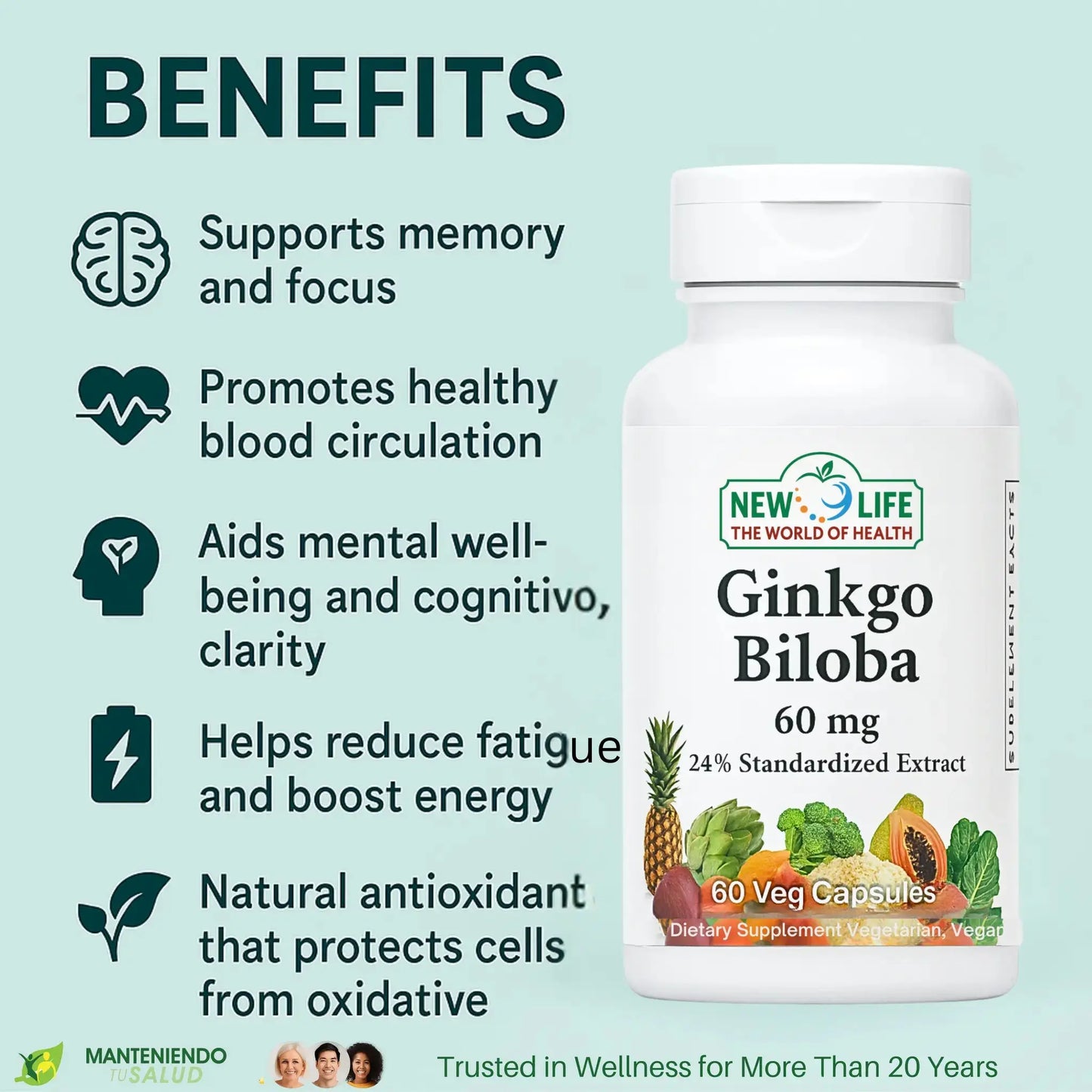 Gingko Biloba: está estandarizado a min. 24% ginkgo flavona glucósidos y 6% lactonas terpénicas. El extracto proviene de las hojas del famoso árbol Ginkgo con su historia dinámica de poblar la tierra durante millones de años.