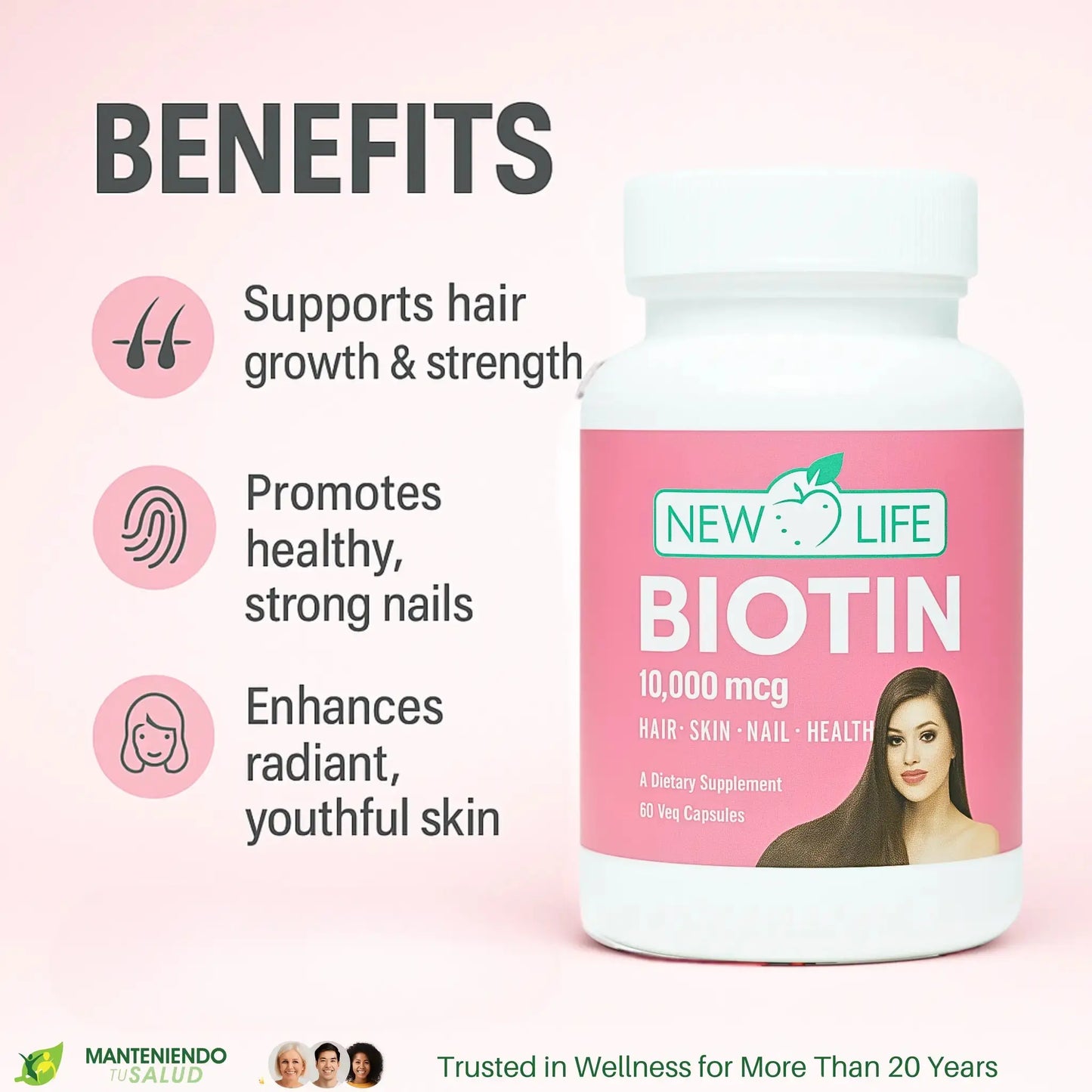 Redefine tu rutina de belleza con Biotin 10.000Mg. Este poderoso suplemento es el ingrediente secreto para las necesidades de crecimiento del cabello, transformando mechones finos y sin vida en mechones exuberantes y brillantes. Pero los beneficios no terminan sólo con el crecimiento del cabello.