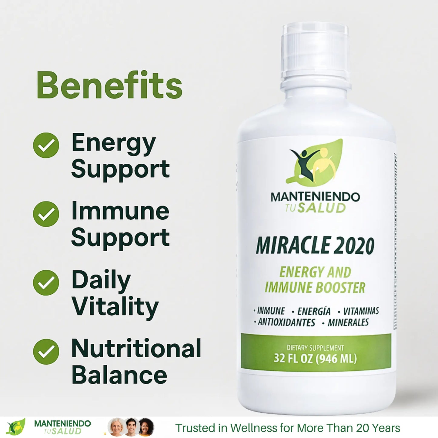 Miracle 2020 Liquid Multivitamin is designed to provide you with the energy needed to power through your day. Packed with essential vitamins and minerals, this multivitamin supports your body’s energy production. Because it is in liquid form, it allows for better absorption, so you can feel more energized quickly. Whether you're tackling your daily tasks or hitting the gym, Miracle 2020 is your partner in maintaining high energy levels and staying active.